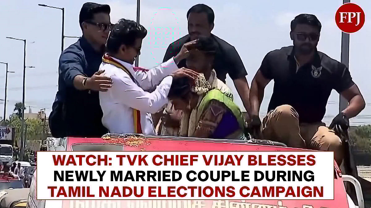 A video of actor and Tamilaga Vettri Kazhagam (TVK) chief Vijay blessing a newly married couple during campaigning for the Tamil Nadu Assembly elections has surfaced. He greeted the couple in an emotional moment as they joined him on top of his campaign van during a poll rally.