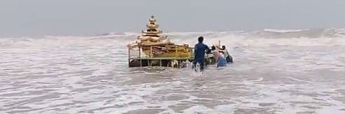 After the impact of cyclone Asani a gold-coloured chariot carried out with the sea waves was seen at Sunnapalli Sea Harbour in Andhra's Srikakulam district on Tuesday, reported NDTV.