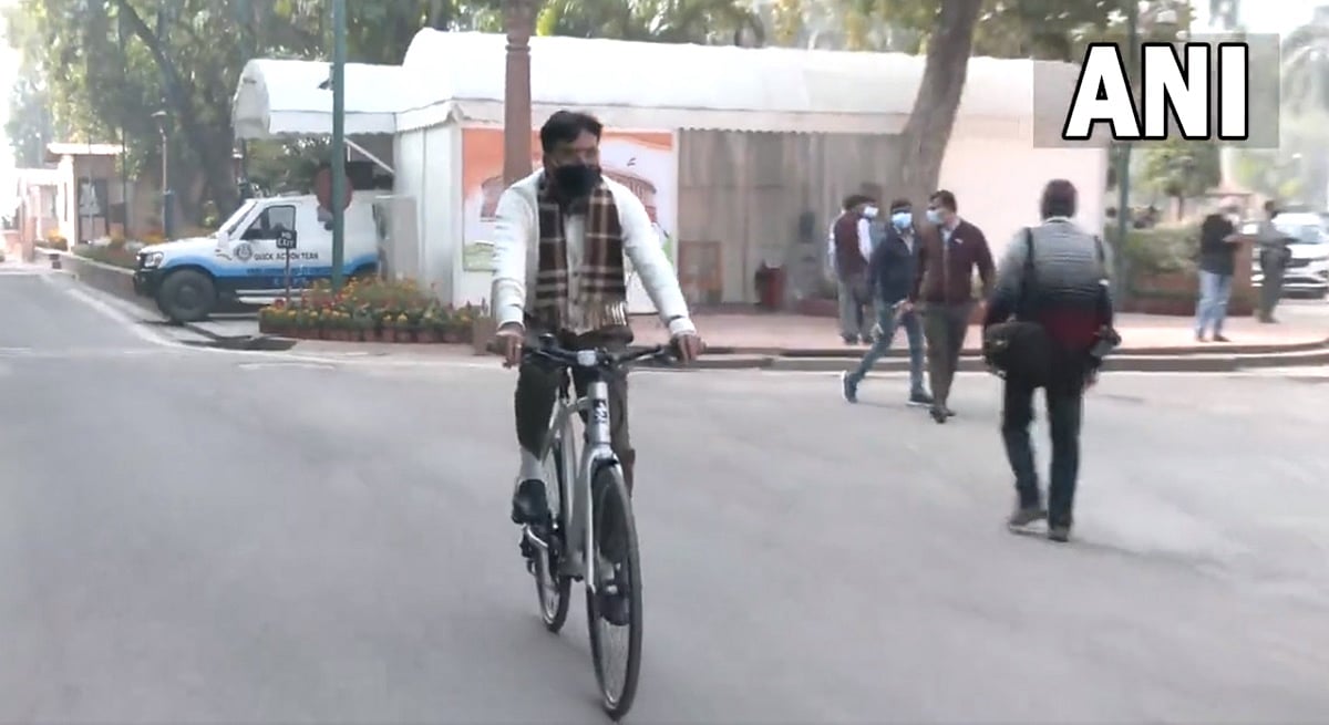 Union Health Minister Mansukh Mandaviya rode a bicycle to the Parliament on Wednesday morning.
