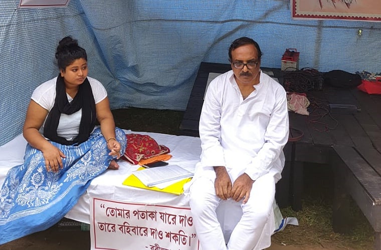 Shantiniketan: The protest at Visva-Bharati University took a new turn on Teachers Day after a student Roopa Chakraborty and a professor Sudipto Bhattacharya sat on indefinite hunger strike 50 meters away from Vice Chancellor Bidyut Chakraborty’s residence.