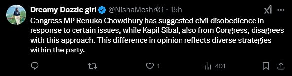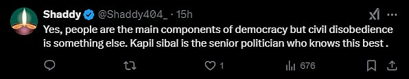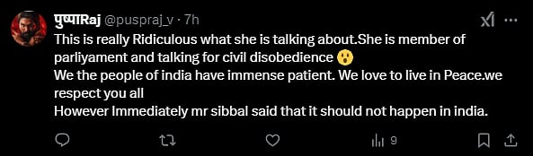 Criticising the Congress MP for talking in favour of civil disobedience, another user wrote, "This is really ridiculous what she is talking about. She is member of the Parliament and talking for civil disobedience. We the people of India have immense patience. We love to live in peace. We respect you all. However, immediately Mr. Sibbal said that it should not happen in India."