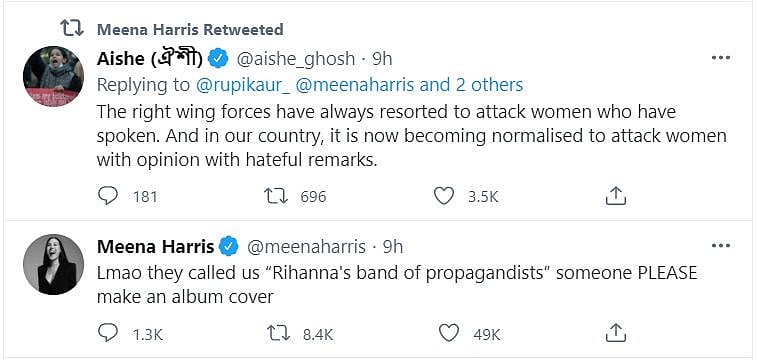 She also retweeted a post by author Rupi Kaur that shared the same photos. "This week Rihanna, Greta Thunberg and Meena Harris brought awareness to India’s farmers' protest and look at the response. Misogyny and rightwing regimes go hand in hand. I implore the world to keep their eyes open and bring international attention to Modi’s harmful farm laws," reads the tweet by Kaur.
