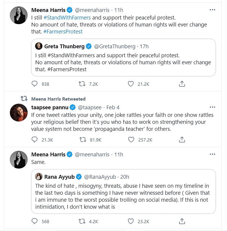 Over the last day or so, Harris has spoken out repeatedly about the farmers' protest, sharing posts by actor Taapsee Pannu and JNU Student's Union President President Aishe Ghosh.