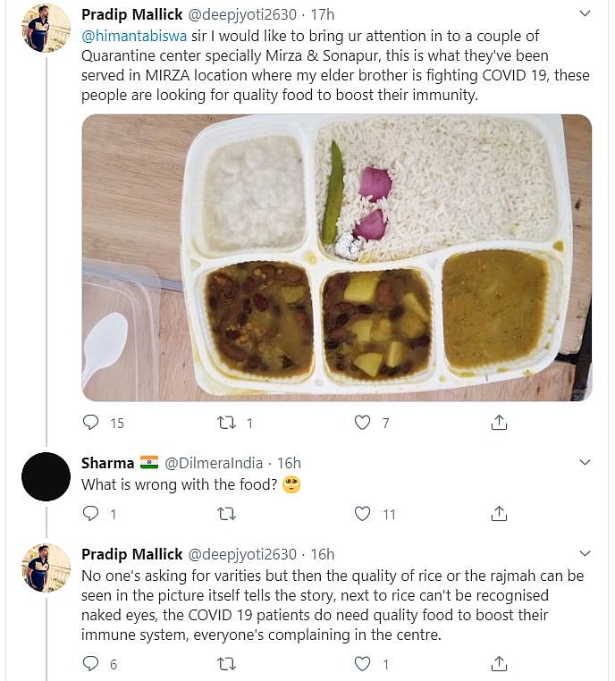 On Sunday however, a Twitter user posted a photo of the meal being served in a quarantine centre in Assam to complain about the food. And while some on the internet noted that the meal seemed to be an acceptable one, the Twitter user insisted that it was sub-par. The images have since been deleted.