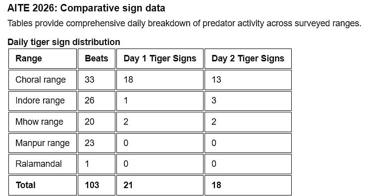 While Indore range saw tiger signs increase from one on day one to three on day two, Manpur range reported constant leopard activity but zero tiger signs throughout 48-hour period. Nationwide results of estimation are expected by July next year.