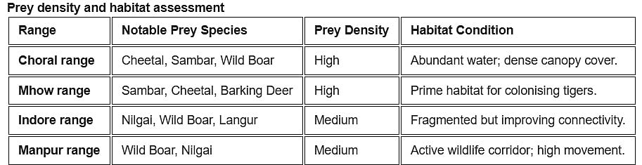 In Mhow range, verified presence of four-year-old male tiger near Malendi village provided evidence of new colonisation.