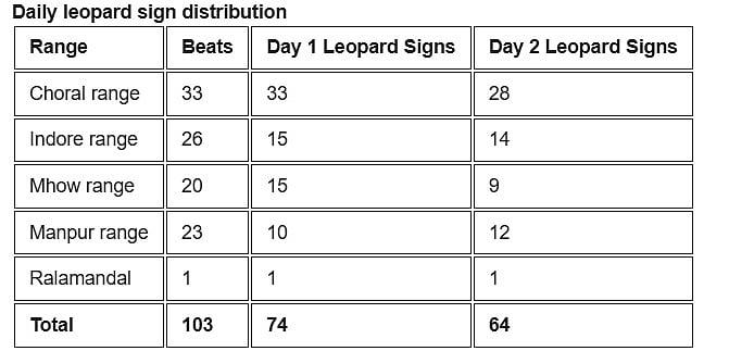 Mhow range recorded two tiger signs and 15 leopard signs on day one, followed by another two tiger signs and nine leopard signs on day two.