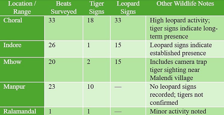 Among the ranges, Choral recorded the highest activity with 18 signs across 33 beats, followed by Mhow with 2 signs in 20 beats, and Indore with 1 sign in 26 beats.