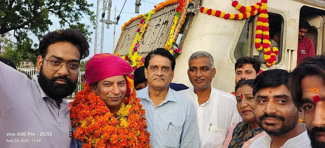 On its first arrival at Badnagar railway station, the Rail Consumer Association and BJP workers honoured the driver of the train by welcoming him with a garland.