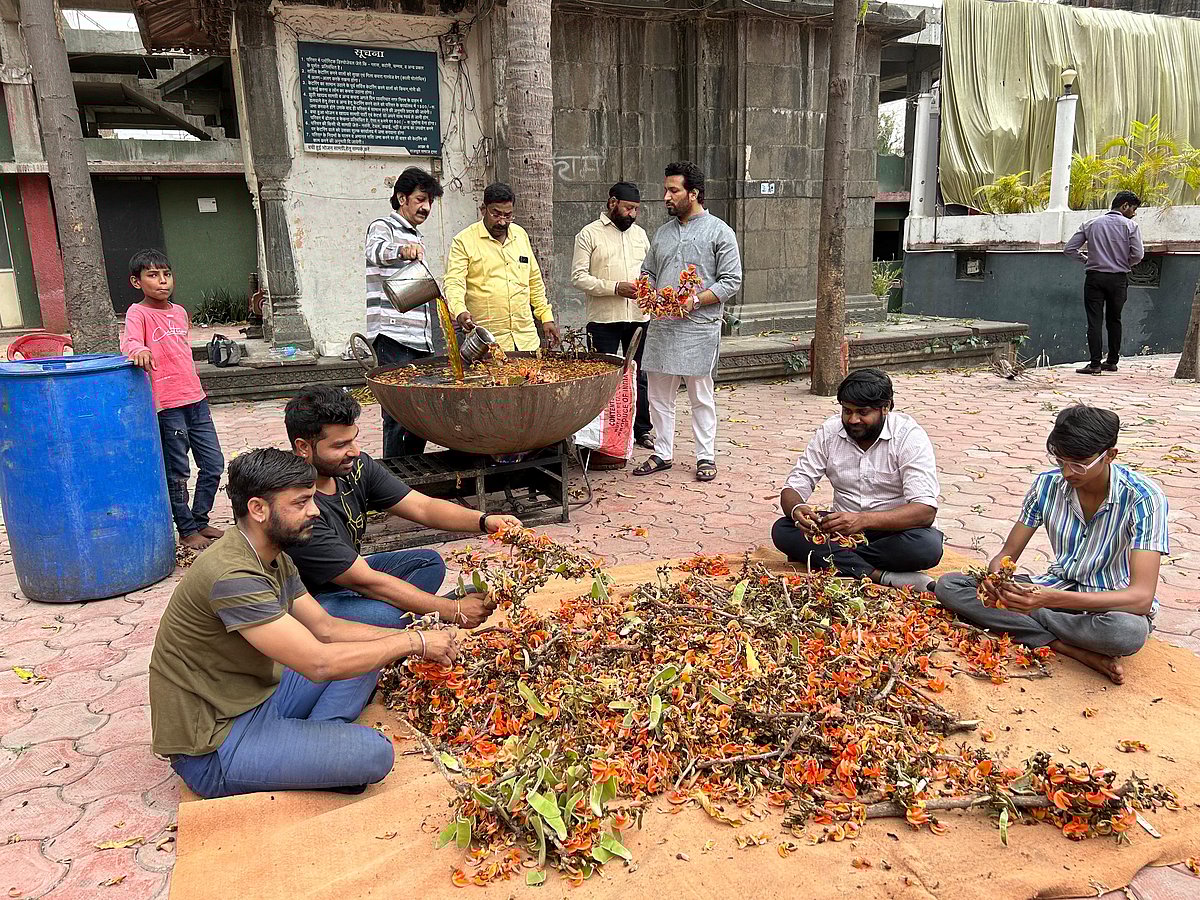 He said that the members of Hind Rakshak and others who volunteer for the work first pick quintals of Tesu flowers from trees and collect them at a place. The flowers are then cleaned and boiled in water. In this process the flowers release colour and the water turns saffron, said Gaur.