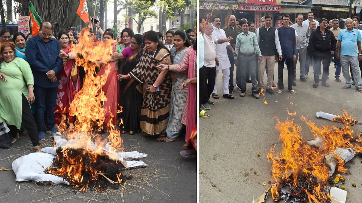 Indore (Madhya Pradesh): Political drama was in full display in the city on Thursday as both the Congress and the Bharatiya Janata Party (BJP) held separate protests, burning effigies of rival leaders over remarks made over the Bhagirathpura contaminated water incident in Madhya Pradesh Assembly.