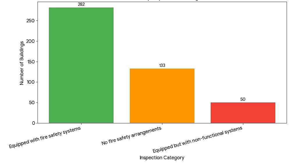Of these, 282 buildings were found equipped with fire safety systems, though 50 of these had non-functional equipment. Meanwhile, 133 buildings were found to have no fire safety arrangements at all.