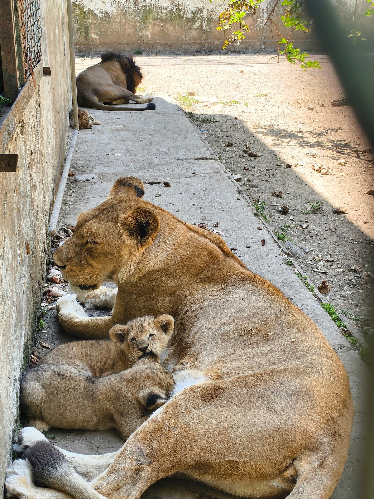 This is the seventh time that lioness Megha has become a mother. According to zoo officials, all three cubs are healthy and the mother lioness is taking good care of them.
