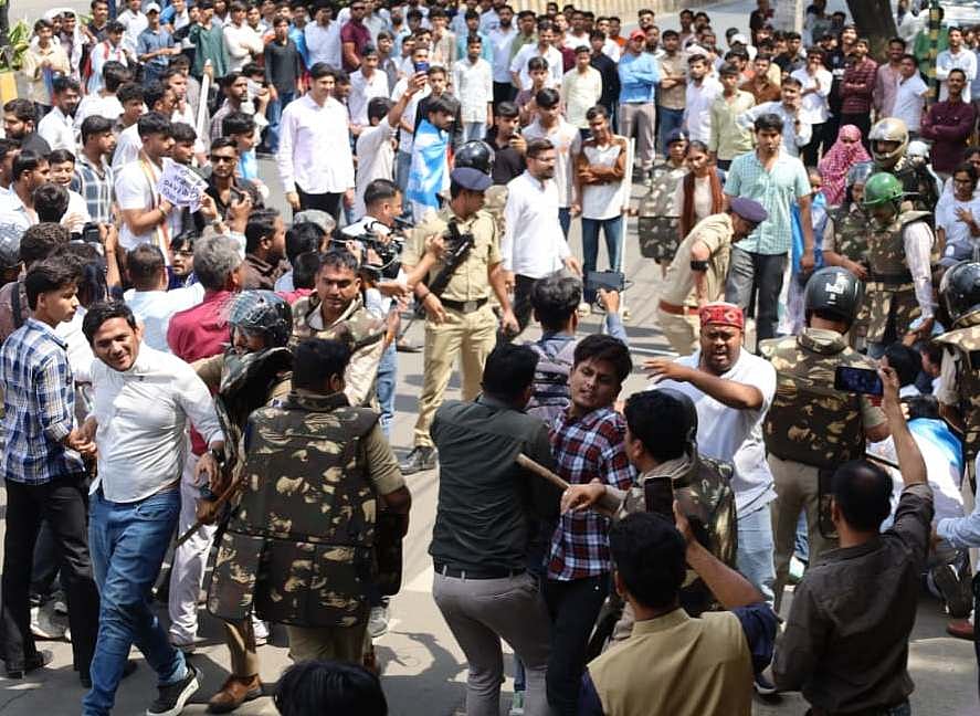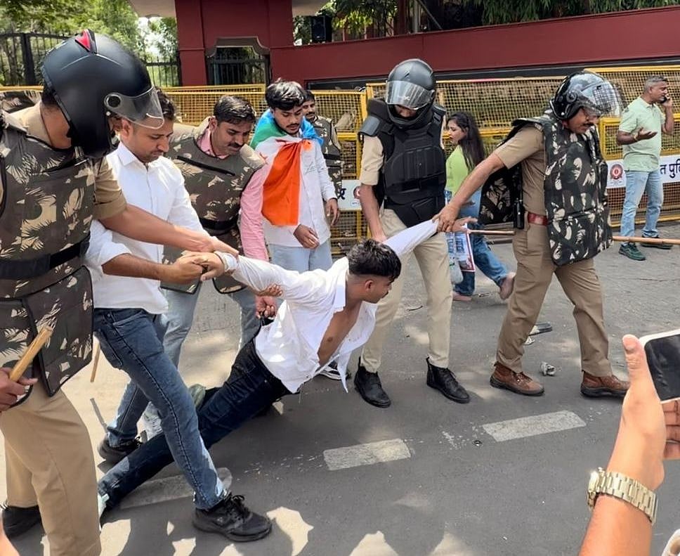 During the protest, there was pushing and scuffling between students and the police. As the situation started to worsen, the police detained NSUI district president Rajat Patel along with five other office bearers.