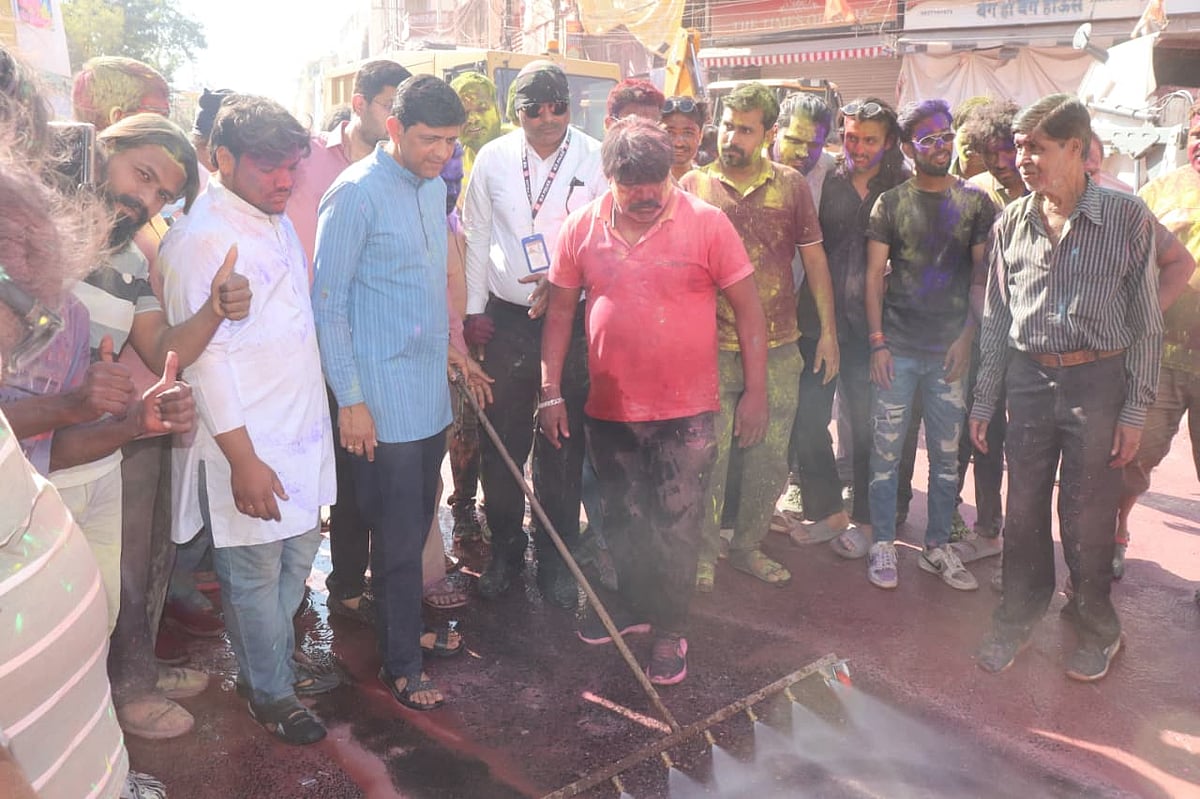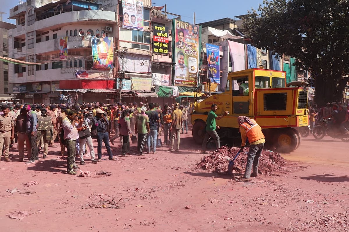 Indore (Madhya Pradesh): The Indore Municipal Corporation’s sanitation team reached Rajwada with necessary resources to carry out cleaning right after the traditional Rang Panchami Gair procession.