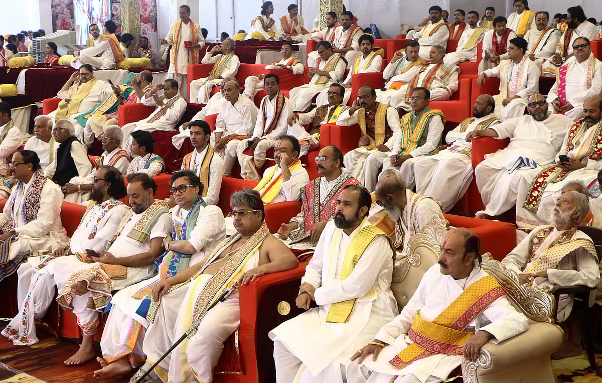 In one of day’s most moving segments, young initiates performed Bhikshakaranam. Carrying staffs and deerskin, boys asked for alms from mothers and gathered Vaishnavas. Maharajshri explained that ritual is designed to teach that every person's skill can be "tuned in" only through humility.