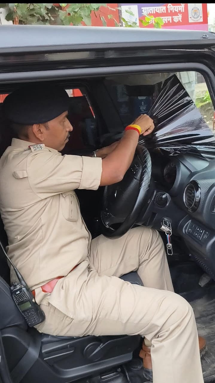 Acting immediately, Subedar Ajnar and constable Rahul stopped the vehicle and found that it was completely covered with black film. The film was removed on the spot and a challan was made for violating traffic rules. The driver was also warned not to use black film in the future.