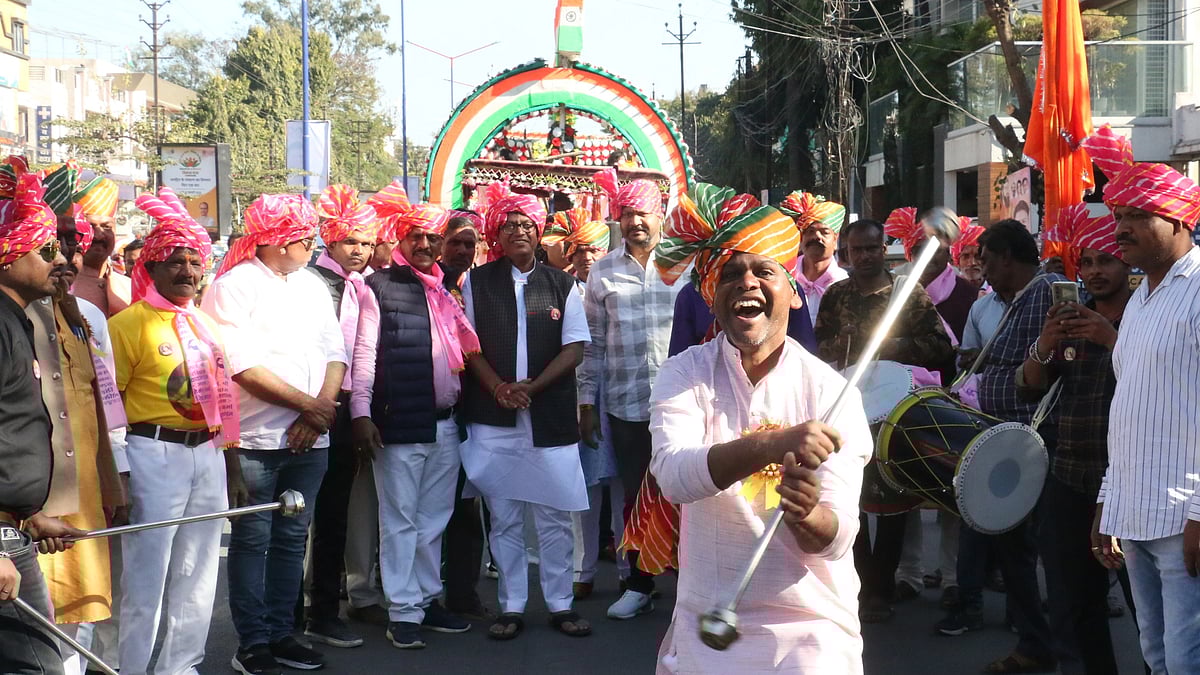 Indore (Madhya Pradesh): The 646th birth anniversary of Sant Shiromani Ravidas was celebrated with great pomp on Sunday. Palki yatra and prabhat pheri were organised in major areas of the city in the morning. In the afternoon, a grand procession was taken out from Rustam Ka Bageecha to Vijayanagar, in which a large number of people participated.