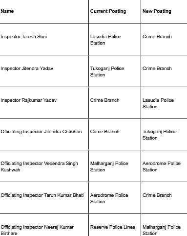 Rajkumar Yadav has been shifted from the Crime Branch to Lasudia police station. In other key changes, officiating inspector Jitendra Chauhan moves from the Crime Branch to Tukoganj, and Vedendra Singh Kushwah has been transferred from Malharganj to the Aerodrome police station.