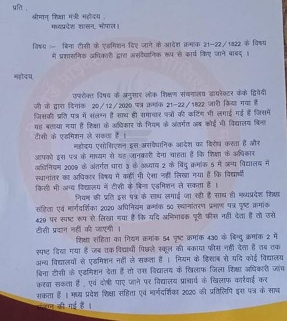 “It is clearly written in Madhya Pradesh Education Code and Guidelines 2020-on the subject of transfer certificate, if the guardian does not pay the full fee, then he will not be given TC,” the letter read.