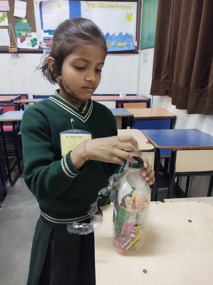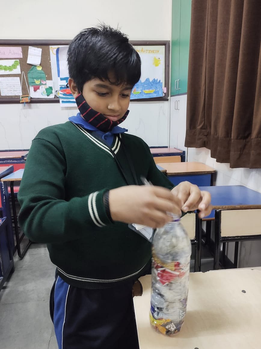 The Students have been asked to collect single use waste plastic bottles and fill them with single use plastic waste like wrappers, milk pouch, oil pouch and others.