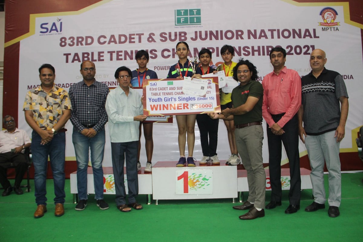 In Under-11 age group, Ankolika Chakraborty (Bengal) defeated K Tanishka (Karnataka) 12-10, 11-5, 11-4, in Under-13 age group, Prisha Goyal (Delhi) won the title by defeating Umte (Maharashtra) 12-10, 13-11, 11-6, 11-4. In girls Under-15 age group, Avani Tripathi (UP) won the final by defeating Sayanika (Delhi) 9-11, 11-8, 12-10, 11-9, 8-11 in a tight match. The prize distribution ceremony was held in the presence of GST Commissioner Lokesh Jatav and Om Soni, President Madhya Pradesh Table Tennis Association.