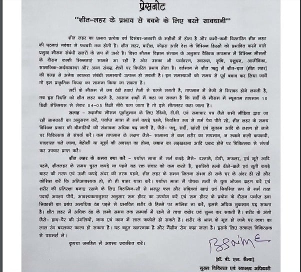 At the same time, the Indore Health Department has issued an advisory on Wednesday for prevention from cold waves after the district started to witness the ‘severe cold’ period.