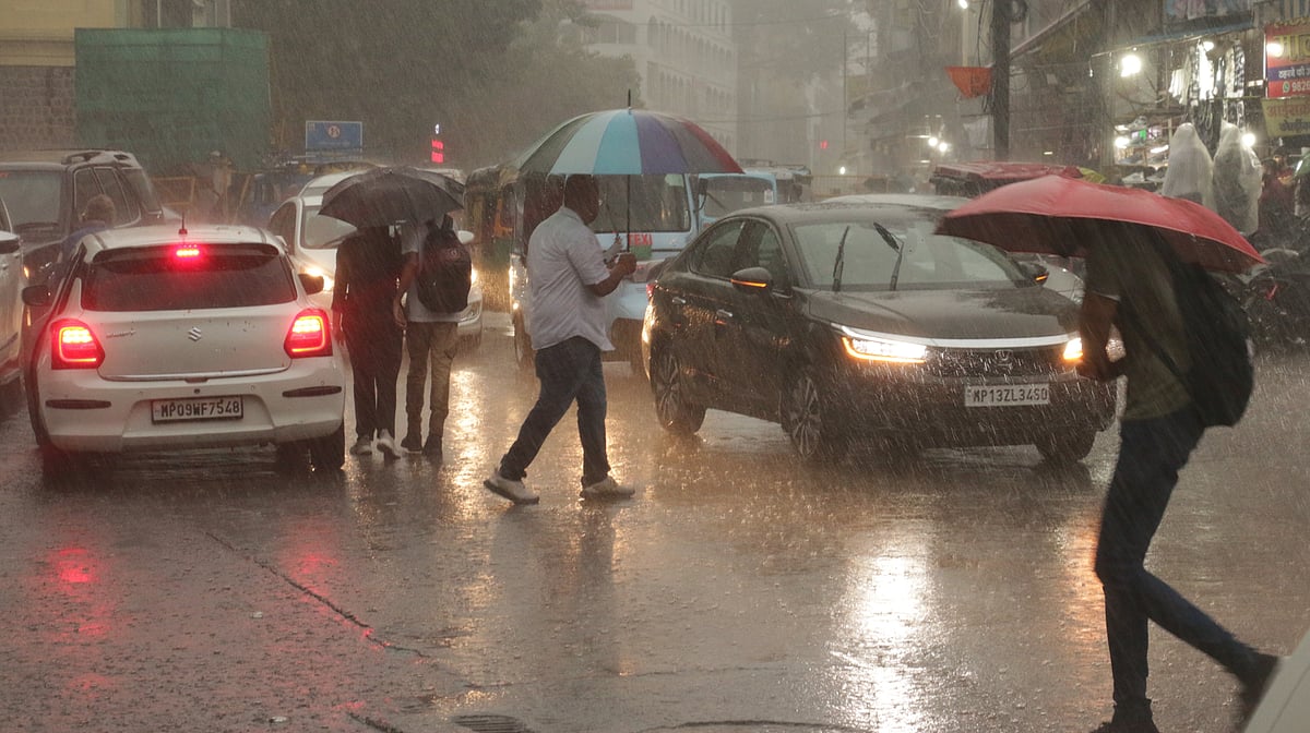 Indore (Madhya Pradesh): The spell of intermittent rains continued to lash the city on Saturday, keeping the temperature stuck to normal. The rain and cloud cover kept the weather pleasant throughout the day but also brought woes for office goers, returning home, who had to brave the showers as well as submerged roads and squares of the city.