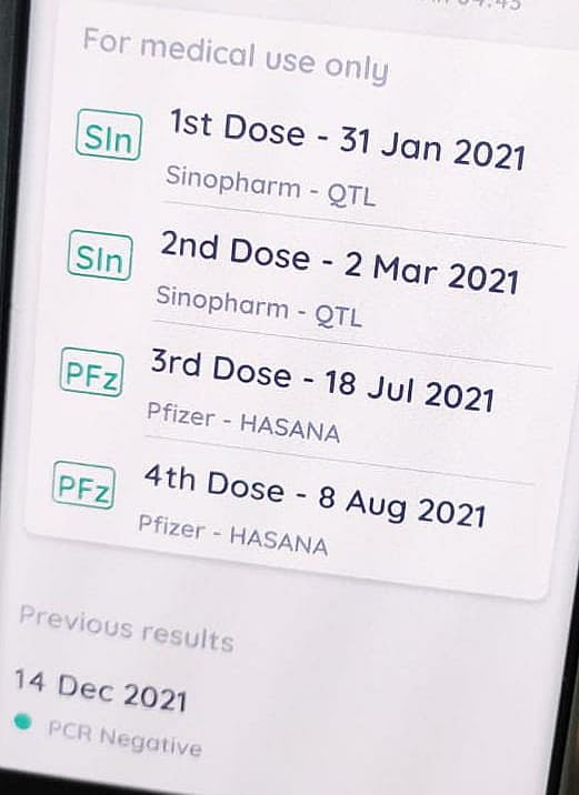 She got jabbed between January and August. She took sinopharm's first dose on January 31, 2021 and its second on March 2, 2021. At the same time she took pizer's first doze on July 18, 2021 and its second dose on August 8, 2021.