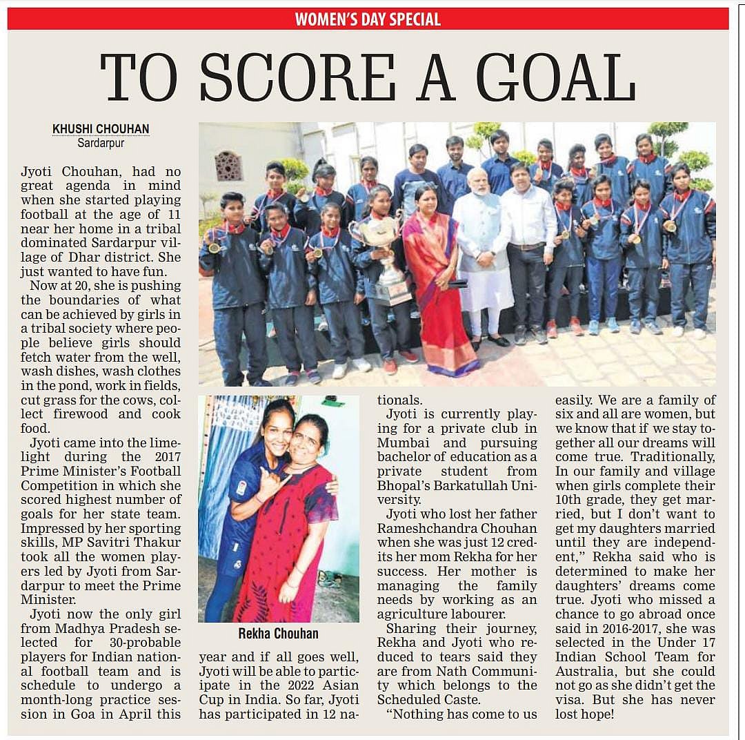 Sardarpur (Madhya Pradesh): Jyoti Chauhan, a promising International football player from Sardarpur tehsil of Dhar district appointed as the Madhya Pradesh Football Association's brand ambassador.