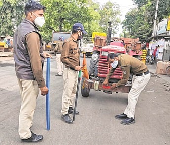 Concerned over these issues, traffic police have started pasting radium stickers behind heavy vehicles such as trucks, old vehicles, tractor-trailers and trolleys.During vehicle checking drive, Rs 1,750 was recovered as fine from violators under the Motor Vehicles (MV) Act.