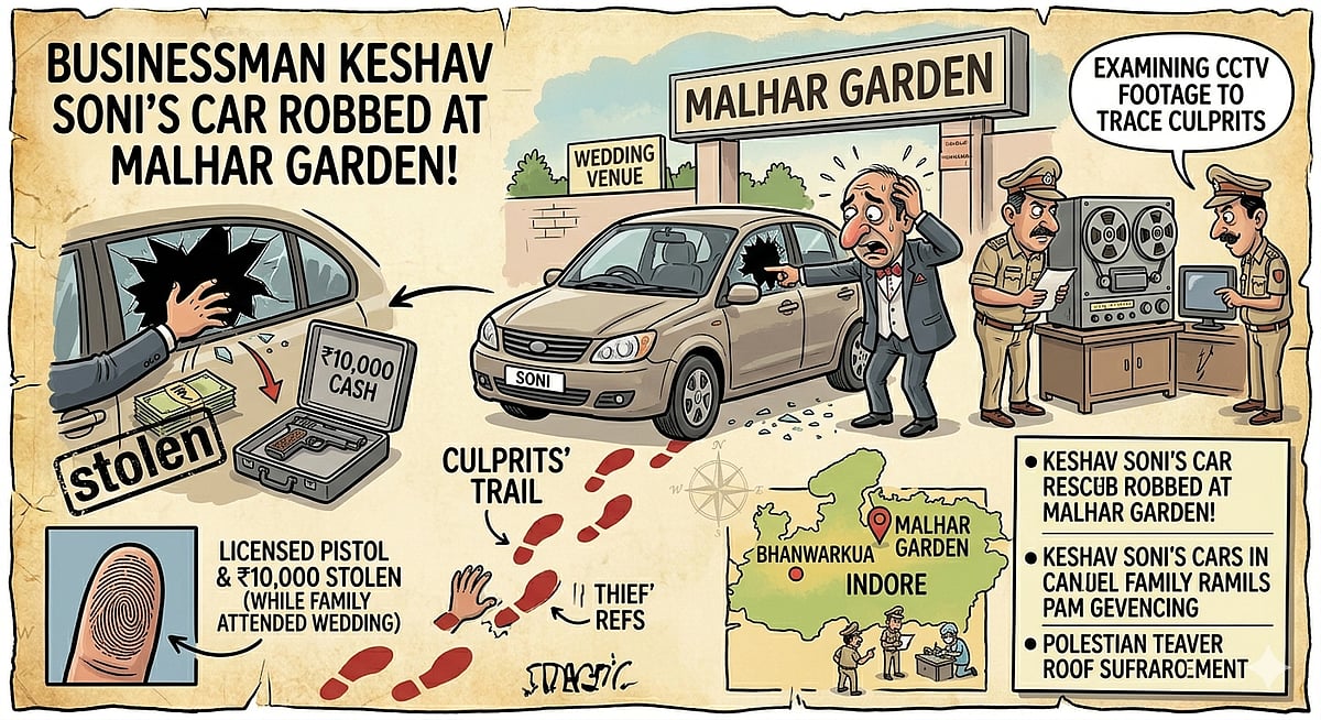 Indore (Madhya Pradesh): Thieves decamped with a bag containing cash and a licensed pistol in just 10 minutes after shattering the window of a businessman’s car parked outside a wedding venue under Bhanwarkua police station limits.