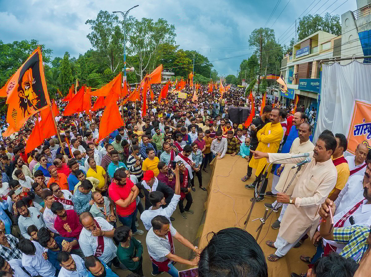Fierce agitation warned Later, the Samiti took out a rally, during which, the youth shouted slogans waving the saffron flag to the Collectorate, and submitted a memorandum to SP Manoj Kumar Singh and Collector Priyank Mishra.