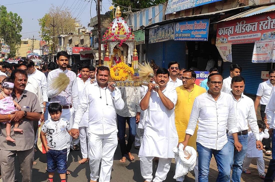 Kukshi: To mark the auspicious occasion of Mahavir Jayanti, members of the local Digambar Jain community on Thursday took out a splendid procession. Lord Mahavir was seated in a beautiful silver palanquin and taken across town. Rupesh Badjatya, a member of the Digamber Jain community told that community members paid obeisance to the last Tirthankara Lord Mahavir. He preached the philosophy of non-violence, truth and compassion to the world. Hundreds of people took part in the procession, which was welcomed by various groups along the procession route.
