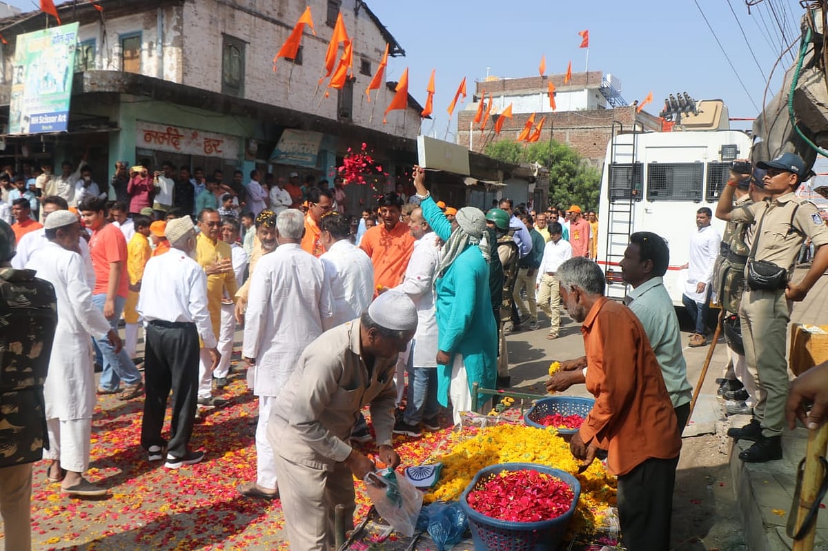 The procession started from the temple located at Bhola Chowk bus stand. After two hours the yatra reached Talab Chowk. This is the same area where communal harmony started deteriorating last year. This time the people of the Muslim community welcomed the Yatra by showering flowers.