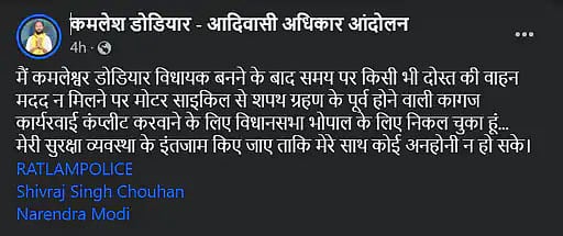 In a post tagged to Prime Minister Narendra Modi, Chief Minister Shivraj Singh Chouhan and Ratlam Police, he expressed the urgency of requiring a four-wheeler and security to travel to Bhopal for essential paperwork before his oath-taking.