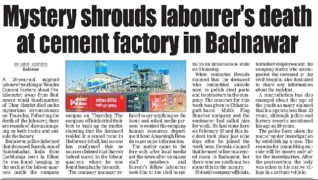 Badnawar (Madhya Pradesh): The mystery surrounding the death of one 20-year-old migrant labourer working at Wonder Cement Factory further shrouds after the deceased father levelled serious allegations against the factory management and the contractor.