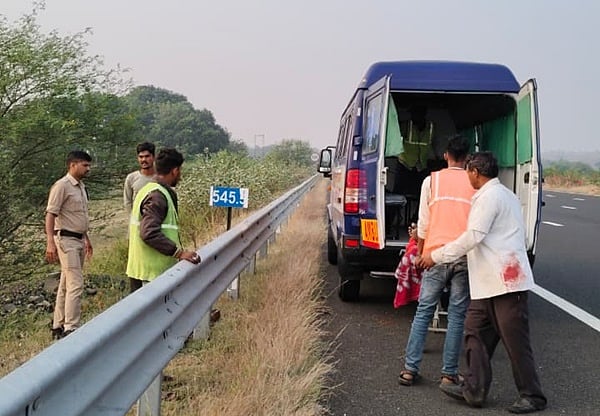 Mandsaur (Madhya Pradesh): Two people died and one was seriously injured after an ambulance fell off a bridge on the Delhi–Mumbai Expressway in Mandsaur on Friday midnight.