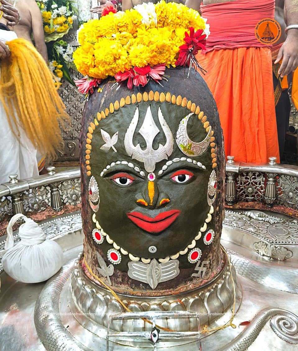 Lord Mahakal was adorned in royal form with bhang, sandalwood and flowers.