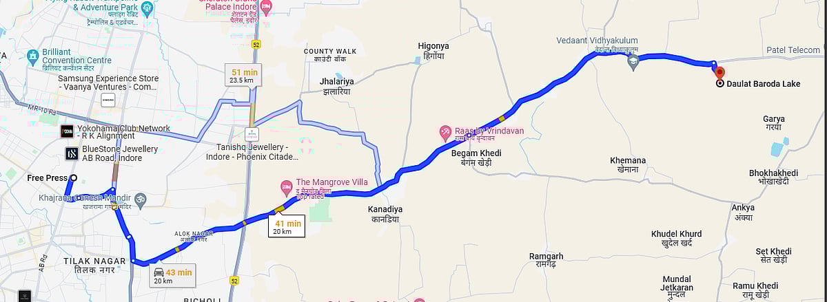 Starting Point: Free Press, Indore Begin by heading east on Free Press Road. LIG Link Rd to Khajrana Main Rd Take LIG Link Road to Khajrana Main Road in Multani Colony. This should take about 6 minutes and cover approximately 2.2 kilometres. Garipipliya Rd and Semliya Chau Rd From Khajrana Main Road, follow Garipipliya Road and then Semliya Chau Road.