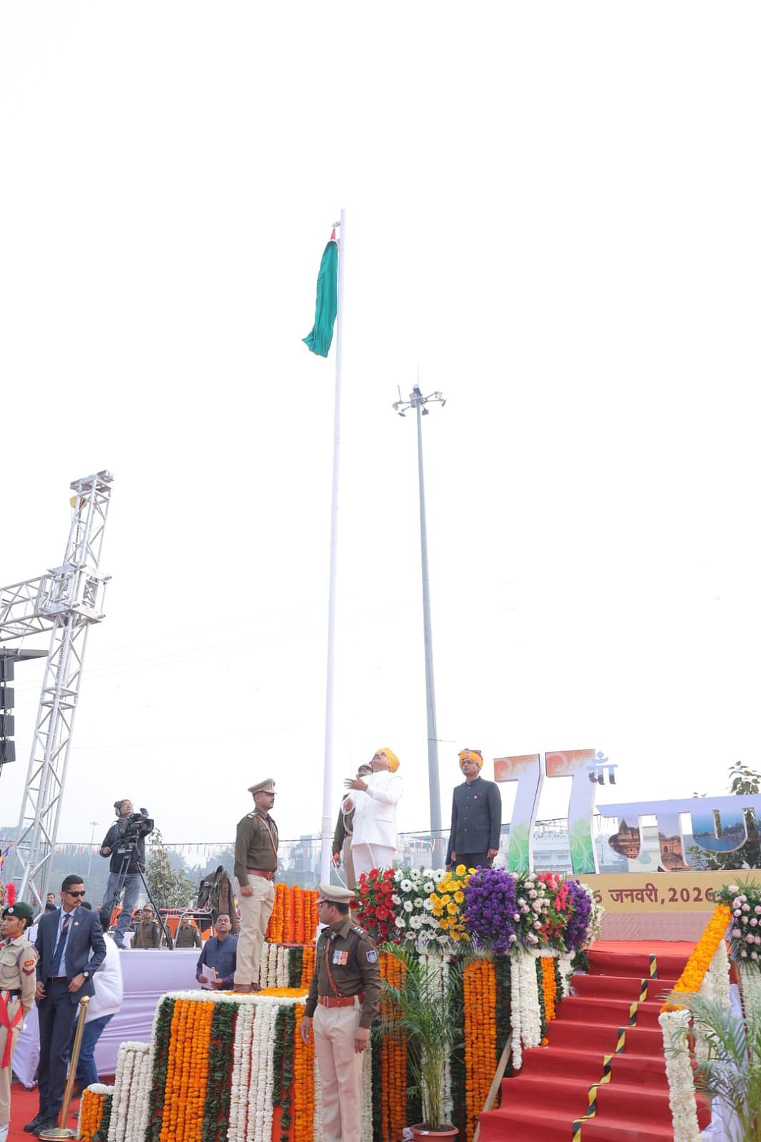 The flag hoisting took place at around 8:30 am in the presence of senior officials, public representatives, students, and a large number of citizens.