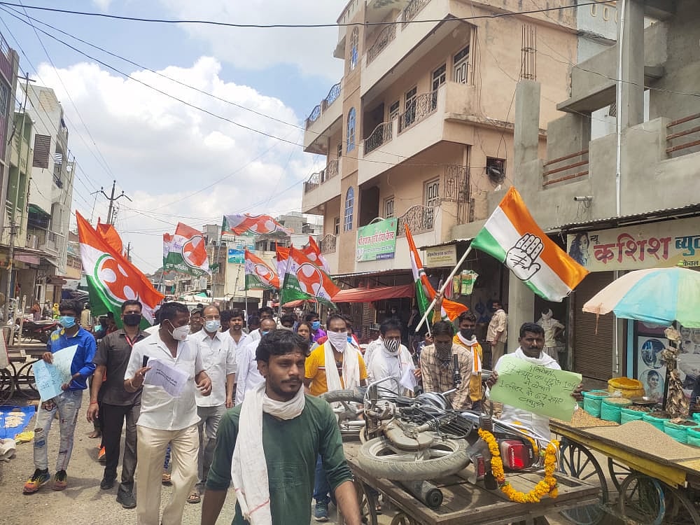 Under the leadership of Thandla MLA Veer Singh Bhuria and Block Congress president Yameen Sheikh, in Meghnagar, after the sloganeering, the Congressmen took out the funeral procession of a motorbike in the whole area regarding the exorbitant price hike of petrol, flouting the Covid norms.