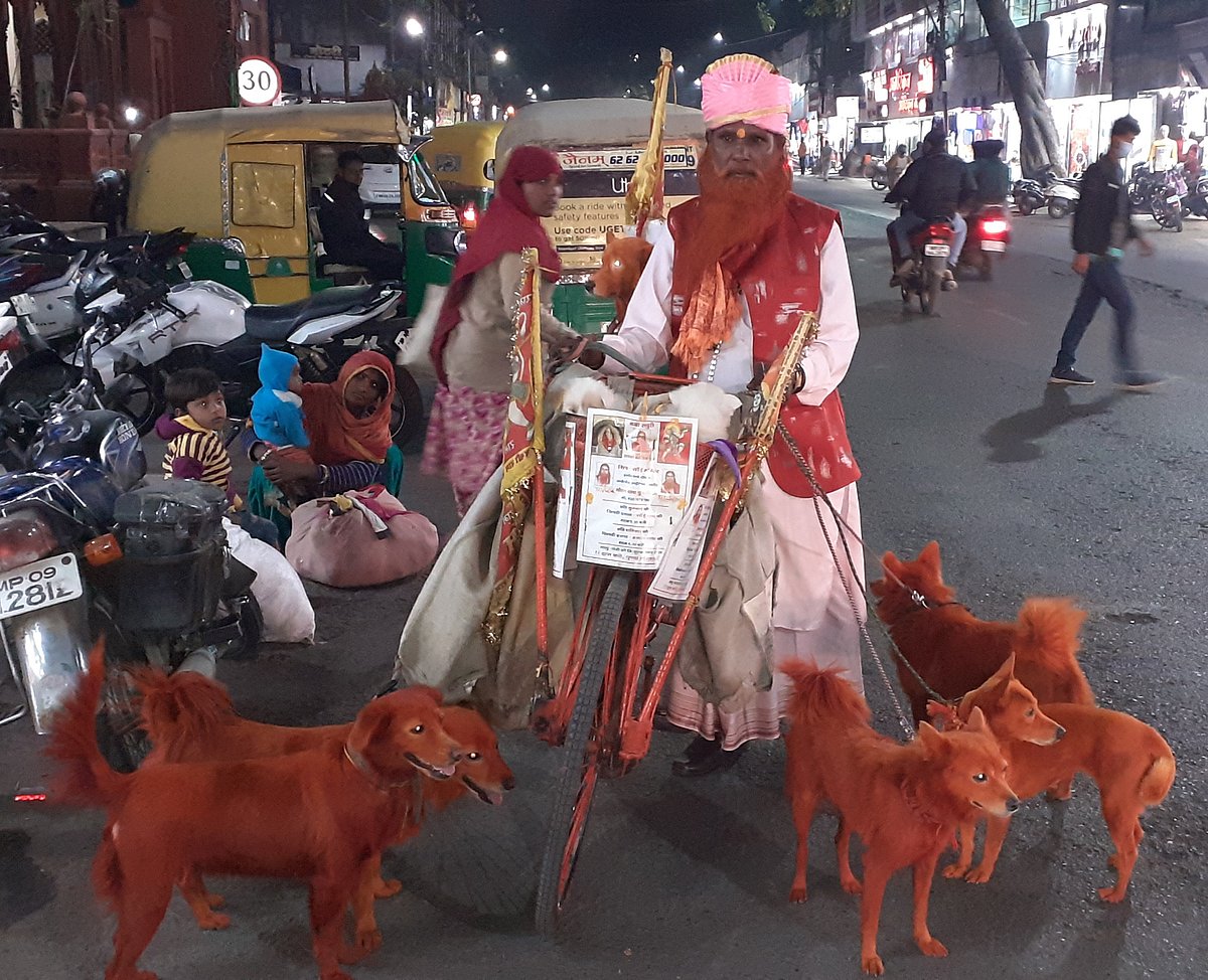 Baba loves his dogs and to keep them cool he applied mehendi (henna) on them and when he takes them out in his cycle for a walk around the city, people stare at him and often talk to him regarding the dogs. He himself sports an orange beard.