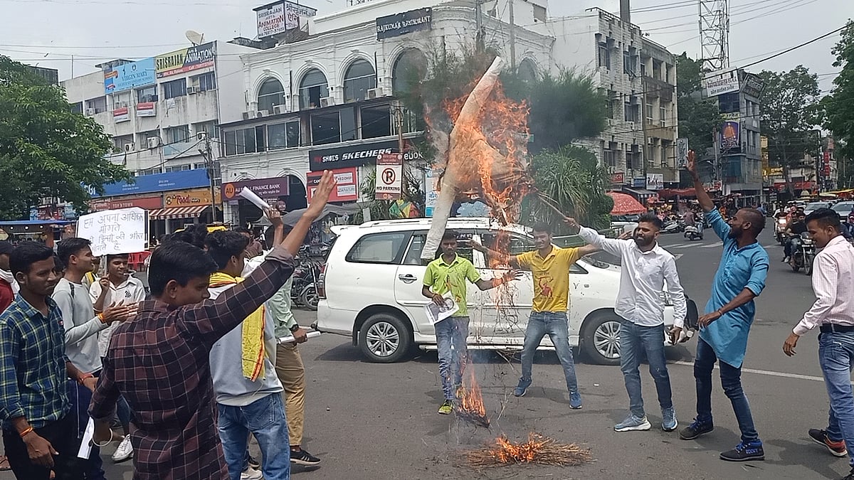 Ujjain (Madhya Pradesh): The members of Dr Ambedkar Vidyarthi Sangathan raised slogans at Tower Chowk, here on Sunday, with placards in their hands and burnt an effigy of Chief Minister Shivraj Singh Chouhan.
