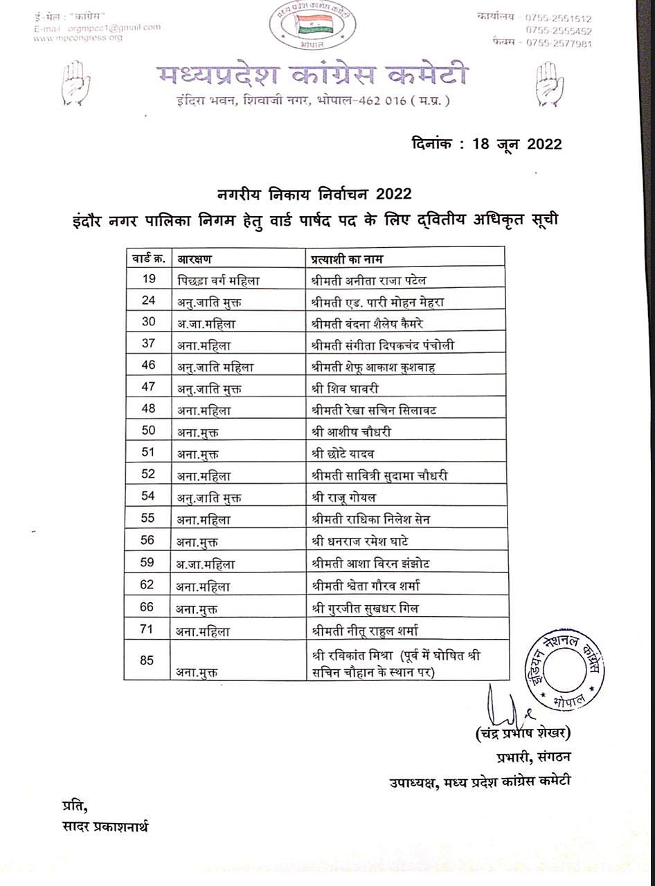 The wards in which the party has announced the final list of candidates were wards 19, 24 and 30 under Indore-II Assembly constituency, wards 55, 56, 59 and 62 under Indore-III Assembly constituency, wards 66 and 71 under Indore-IV Assembly constituency, wards 37, 46, 47, 48, 50, 51, 52 and 54 under Indore-V.