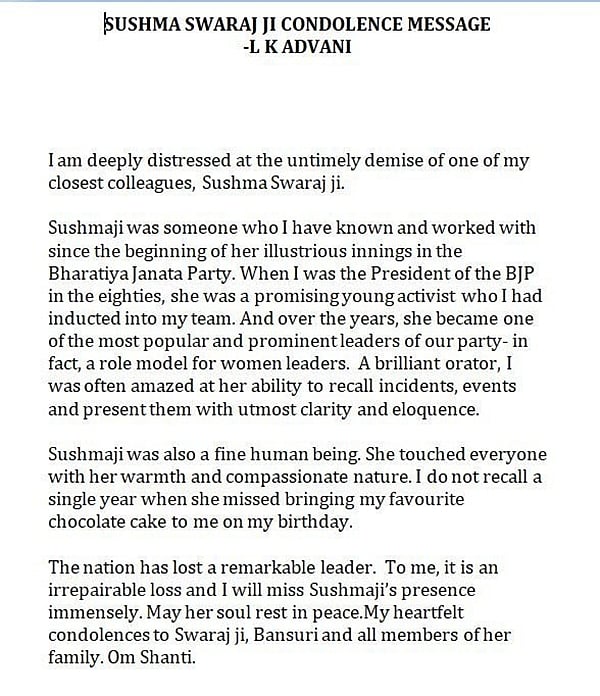 To me, it is an irreparable loss and I will miss Sushmaji’s presence immensely. May her soul rest in peace. My heartfelt condolences to Swaraj ji, Bansuri & all members of her family. Om Shanti. #SushmaSwaraj