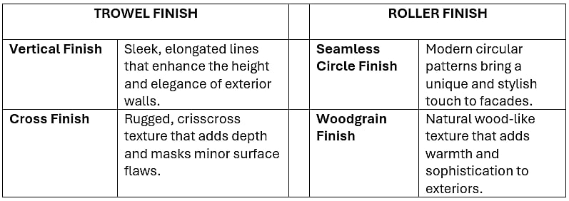 Textured finishes add character and uniqueness to your exteriors. They create a premium look that regular paint cannot match.