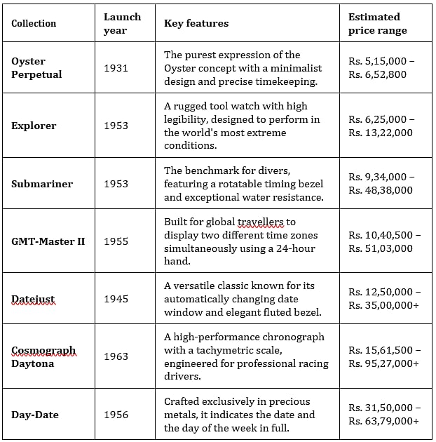 Choosing a Rolex involves understanding the heritage and specific purpose of each legendary collection. Below is a breakdown of these iconic timepieces along with their estimated price ranges in India for 2026.