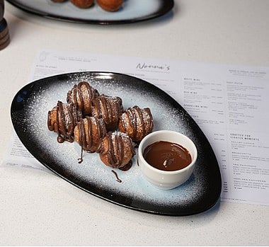 Si Nonna's Hazelnut & Chocolate Dough Balls are a perfectly simple and comfort food. These warm, fried dough morsels are a delightful experience once dunked into their rich hazelnut chocolate sauce. It's a delicious combination of textures and flavours, offering the perfect way to end your meal on a sweet note.