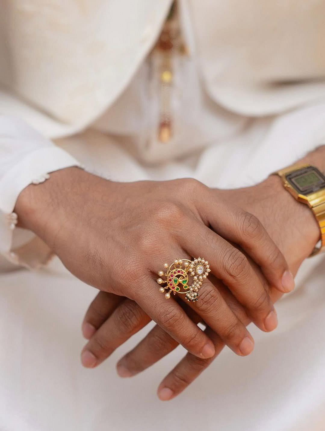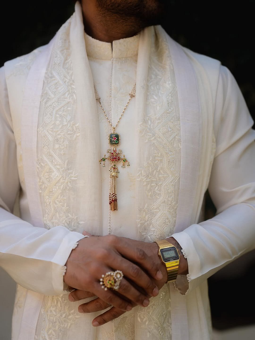 He further accessorised with the brand's Roshini ear cuff, adding an edgy yet traditional twist to his ensemble. Complementing the jewellery were a Sahya ring and a sleek gold watch.